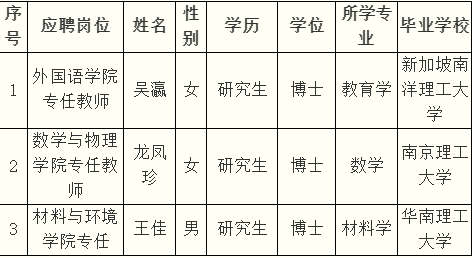 我校2022年公開招聘專任教師,經(jīng)過資格審查、試講、面試、綜合考核等程序,校長辦公會審定,現(xiàn)將擬聘用人員吳瀛等3人的有關(guān)情況予以公示,公示期為7天。公示期間,如對擬聘用人員有異議,請于2022年4月18日前,將署真實姓名的書面材料送至學(xué)校人事處(聯(lián)系人:潘老師,聯(lián)系電話:0771-3260113)。擬聘用人員需參照公務(wù)員標(biāo)準(zhǔn)進行體檢,體檢合格方可錄用。