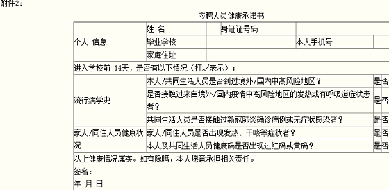 (一)現(xiàn)場資格審核、筆試、面試等環(huán)節(jié)進入學校時,須提供健康碼、行程碼、72小時內(nèi)的核酸檢測陰性證明及《應聘人員健康承諾書》(附件2)。