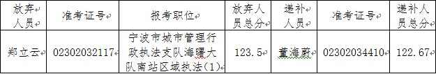 2015年寧波市海曙區(qū)機(jī)關(guān)考試錄用公務(wù)員資格復(fù)審定于2015年5月28日進(jìn)行,根據(jù)公告規(guī)定,面試對(duì)象在開(kāi)始資格復(fù)審2天前,書(shū)面提出不參加資格復(fù)審的,均在該職位筆試合格分?jǐn)?shù)線以上人員中,按筆試總成績(jī)從高分到低分予以遞補(bǔ)。我區(qū)在規(guī)定時(shí)間內(nèi)提出書(shū)面申請(qǐng)放棄公務(wù)員資格復(fù)審1人,遞補(bǔ)1人,F(xiàn)公告如下: