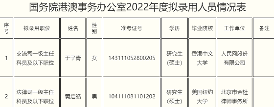 按照中央機(jī)關(guān)及其直屬機(jī)構(gòu)2022年度考試錄用公務(wù)員工作有關(guān)要求,根據(jù)考生的綜合成績(jī)、體檢結(jié)果和考察情況,經(jīng)研究,擬錄用于子青、黃啟皓2人為我辦公務(wù)員。現(xiàn)對(duì)錄用職位及擬錄用人員情況進(jìn)行公示。如對(duì)擬錄用人員存有異議,請(qǐng)?jiān)诠酒趦?nèi)向我辦人事司反映。