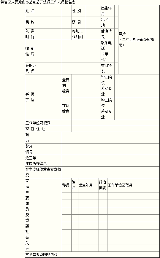 說明:1.人員性質(zhì)填公務(wù)員或參公;2.工作簡(jiǎn)歷從大學(xué)開始填寫,時(shí)間要填寫到月,填寫清楚工作變化時(shí)間(包括工作崗位變化時(shí)間);3.籍貫、出生地填寫到鄉(xiāng)鎮(zhèn)街道(如黃巖西城);4.如在主流媒體有發(fā)表文章請(qǐng)附復(fù)印件;5.“家庭主要成員及重要社會(huì)關(guān)系”欄,主要填寫本人的父母、子女、兄弟姐妹及配偶的父母、兄弟姐妹,已退休、離休、離崗?fù)损B(yǎng)、去世等,應(yīng)在填寫原單位職務(wù)后加括號(hào)注明“(已退休)”“(已離休)”“(已去世)”等。若存在違紀(jì)違法處理情況的,請(qǐng)具體填寫時(shí)間,違紀(jì)違法原因,處理結(jié)果,寫不下可另附頁(yè)。