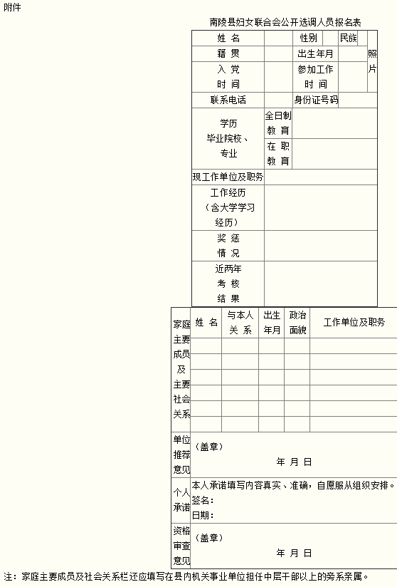 2.報(bào)考人員應(yīng)仔細(xì)閱讀選調(diào)公告,按照要求填寫報(bào)名表,所填信息應(yīng)當(dāng)真實(shí)、準(zhǔn)確、規(guī)范。報(bào)考人員提交《南陵縣婦女聯(lián)合會(huì)公開選調(diào)人員報(bào)名表》(見附件)紙質(zhì)版及電子版各1份、有效身份證件原件及復(fù)印件、學(xué)歷證書原件及復(fù)印件、近期免冠2寸藍(lán)底彩色照片2張。由單位推薦的,單位主要負(fù)責(zé)人須在推薦意見欄中簽署意見并加蓋公章。