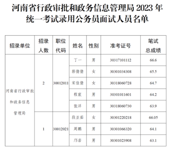 根據(jù)《河南省2023年統(tǒng)一考試錄用公務(wù)員工作實(shí)施方案》和《河南省2023年統(tǒng)一考試錄用公務(wù)員和公開(kāi)遴選公務(wù)員面試工作安排》要求,現(xiàn)將河南省行政審批和政務(wù)信息管理局2023年統(tǒng)一考試錄用公務(wù)員面試有關(guān)事項(xiàng)公告如下:
