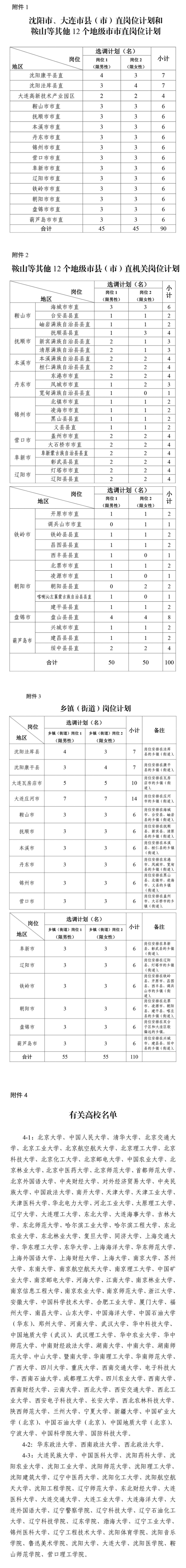 2.鞍山等其他12個(gè)地級(jí)市縣(市)直機(jī)關(guān)崗位計(jì)劃選調(diào)100人,具體崗位計(jì)劃見(jiàn)附件2,選調(diào)范圍包含附件4中4-1所列高校應(yīng)屆優(yōu)秀畢業(yè)生;4-2所列高校法學(xué)類(lèi)專(zhuān)業(yè)應(yīng)屆優(yōu)秀畢業(yè)生;4-3所列高校碩士研究生及以上學(xué)歷應(yīng)屆優(yōu)秀畢業(yè)生。
