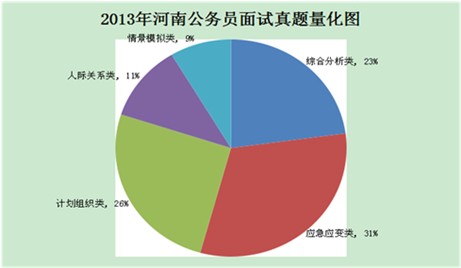 由2012年的考題量化圖可知,綜合分析類、組織計劃類和應急應變類試題在當年所占比例平分秋色,但是在2013年,應急應變類試題超越了前兩者所占的比例,迅速成為了考題中的“頭牌”。這主要是由于隨著社會的飛速發(fā)展,各種社會矛盾層出不窮,如何解決各種各樣的矛盾已經(jīng)成為公務員所必須首要掌握的技能之一,所以可以預感到在2014年的面試中此類試題也會是重中之重。
