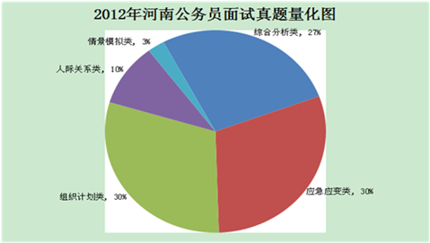 河南省考2013年的面試真題結(jié)構(gòu)(詳情見下圖)與2012年(詳情見下圖)一致,只考察5種核心題型,即:綜合分析類、計劃組織類、應急應變類、人際關(guān)系類、情景模擬類。通過對比發(fā)現(xiàn),前三者是命題重點所在,人際關(guān)系和情景模擬所占比重較小,但所占比例有所增加。