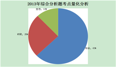 2013年的社會熱點現(xiàn)象主要考察了社會、生態(tài)、時政三種綜合分析類型,與2012年主考時政題相比,2013年則將社會類作為考察重點,統(tǒng)計后可以得到下圖: