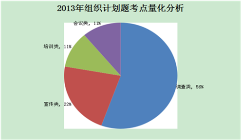 2013年省考里邊的組織計劃類試題主要包括以下幾個方面:調(diào)查類、宣傳類、培訓類、會議類,下邊給出此類試題的量化分析。