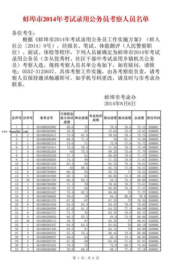 2014年安徽省蚌埠市公務(wù)員考試錄用考察人員名單