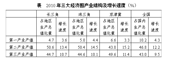 三大經(jīng)濟(jì)圈中,2010年三次產(chǎn)業(yè)增長(zhǎng)速度均超過(guò)全國(guó)平均水平的有幾個(gè)?