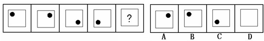 (答案:B。黑點在正方形中順時針移動。在第5個圖形中,應(yīng)該正好移動到左上角。)