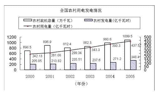 2、根據(jù)上圖,下列關(guān)于我國(guó)農(nóng)村用電發(fā)電情況的表述,錯(cuò)誤的一項(xiàng)是( )。