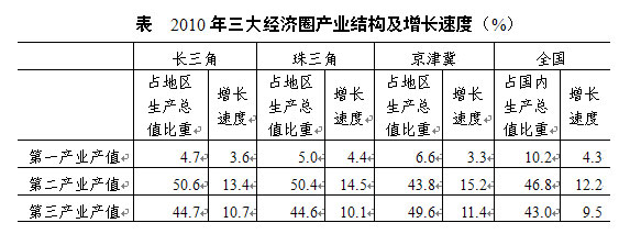 三大經(jīng)濟(jì)圈中,2010年三次產(chǎn)業(yè)增長速度均超過全國平均水平的有幾個?