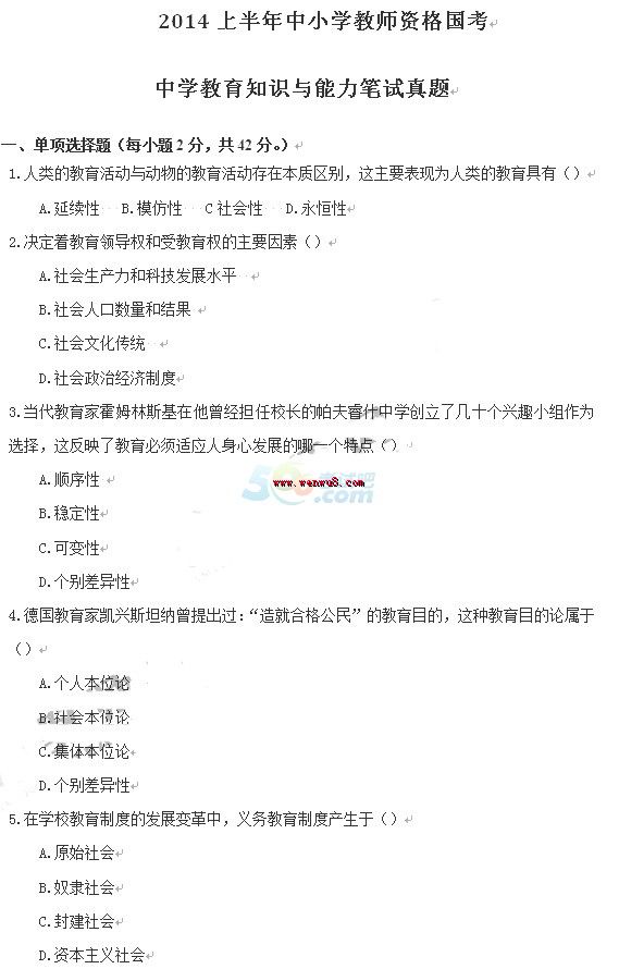 2014上半年教師資格考試《中學(xué)教育知識(shí)與能力》真題及答案