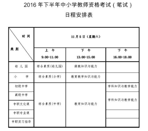 2016年中小學教師資格考試下半年筆試日期為 11 月 5 日,面試日期為 2017 年 1 月 7 至 8 日。