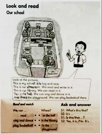 1.能聽說認(rèn)讀classroom, hall, garden, playground, library等單詞,正確使用“in the +”短語,并能運用what’s this ?this is …進(jìn)行對話。