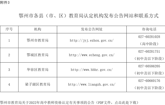 3.鄂州市各縣(市、區(qū))教育局認(rèn)定機構(gòu)發(fā)布公告網(wǎng)站和聯(lián)系方式