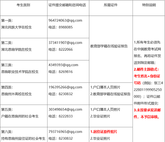 本次教師資格面試全部采取網(wǎng)上審核,請(qǐng)不同類別考生按要求提交相關(guān)證件照片至相應(yīng)指定郵箱,具體安排如下: