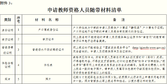 2.申請人需攜帶材料:按照《申請教師資格人員隨帶材料清單》(附件3),準備好相關材料。