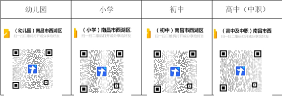 申請(qǐng)人在5月16日前,分幼兒園、小學(xué)、初中、高中(中職)4個(gè)學(xué)段,通過(guò)微信分別“掃一掃”以下二維碼提交。
