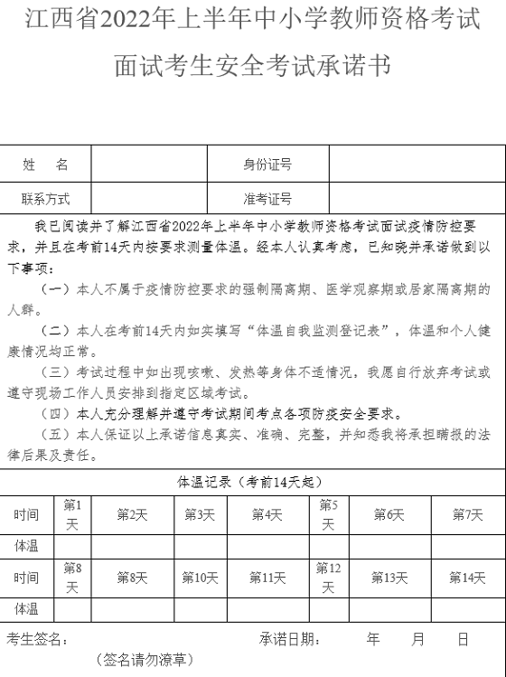(一)備考期間,考生須做好個人防護和進行考前14天的自我健康狀況監(jiān)測,并認真閱知、如實填寫、鄭重簽署《2022年上半年江西省中小學教師資格面試考生安全考試承諾書》(可從江西教育網(wǎng)、贛州教育網(wǎng)下載),入場時交給工作人員。