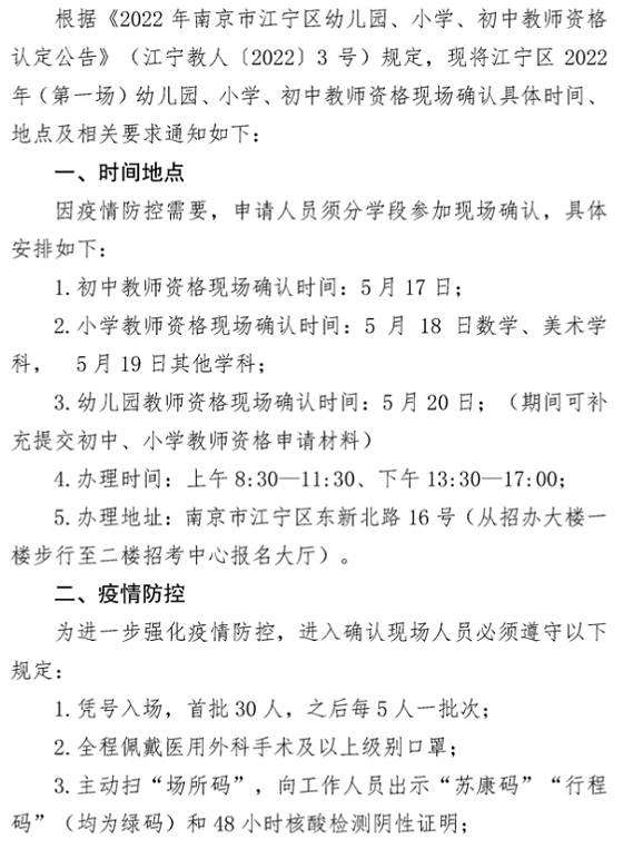 2022年江蘇南京市江寧區(qū)(第一場(chǎng))幼兒園、小學(xué)、初中教師資格現(xiàn)場(chǎng)確認(rèn)通知