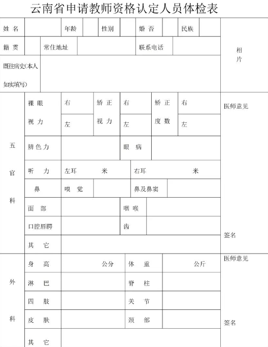 附件1:《云南省申請教師資格認(rèn)定人員體檢表》