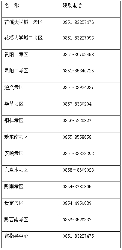 (二)本次面試共設13個考區(qū):花溪大學城一考區(qū)(特殊教育、幼兒園、小學)、花溪大學城二考區(qū)(初中、高中、中職)、貴陽一考區(qū)、貴陽二考區(qū)(初中、高中)、遵義考區(qū)、畢節(jié)考區(qū)、銅仁考區(qū)、黔東南考區(qū)、安順考區(qū)、六盤水考區(qū)、黔南考區(qū)、貴定考區(qū)、黔西南考區(qū)。由于報考人數(shù)分布不均,各考區(qū)報考人數(shù)達到容量上限后,該考區(qū)系統(tǒng)將自動關閉。考生需盡早報名,否則會出現(xiàn)擬報考區(qū)達到容量上限后無法選擇該考區(qū)的情況。由于本次面試考生規(guī)模較大,各考區(qū)可能會安排不同地址的分散考點(考點分配由系統(tǒng)在所報考區(qū)內隨機安排),請考生務必提前做好準備并按照準考證規(guī)定的時間、地點參加面試,以免造成延誤。考生如對面試有任何疑問,請及時與所報考區(qū)聯(lián)系,各考區(qū)及省指導中心咨詢電話一覽表如下:
