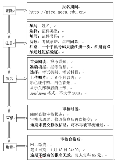5.繳費(fèi)。采用網(wǎng)上繳費(fèi)方式,考生須等待信息審核通過(guò)后方可進(jìn)行繳費(fèi)。網(wǎng)上繳費(fèi)截止日期為:1月18日24:00,逾期不繳費(fèi)的報(bào)名無(wú)效。根據(jù)津發(fā)改價(jià)費(fèi)〔2016〕712號(hào)文件規(guī)定,我市全國(guó)中小學(xué)教師資格考試收費(fèi)標(biāo)準(zhǔn)為:筆試費(fèi)每科65元。