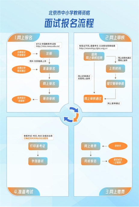 網(wǎng)上審核首先通過(guò)數(shù)據(jù)比對(duì)方式進(jìn)行初審?忌瓿蓤(bào)名后24小時(shí)內(nèi)務(wù)必隨時(shí)關(guān)注面試審核系統(tǒng),或使用手機(jī)關(guān)注“北京市教師資格”微信公眾號(hào)查詢網(wǎng)上初審結(jié)果。如審核結(jié)果顯示為“初審?fù)ㄟ^(guò)無(wú)需復(fù)審”,考生可在繳費(fèi)截止前隨時(shí)登錄教育部“中國(guó)教育考試網(wǎng)-中小學(xué)教師資格考試欄目(http://ntce.neea.edu.cn)”報(bào)名網(wǎng)頁(yè)查看進(jìn)度,顯示為“待支付”后,考生可直接進(jìn)行繳費(fèi)。