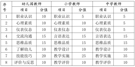中小學(xué)教師資格考試面試滿分100分,各項(xiàng)目分值具體如下(中職教師面試分值同中學(xué)教師):