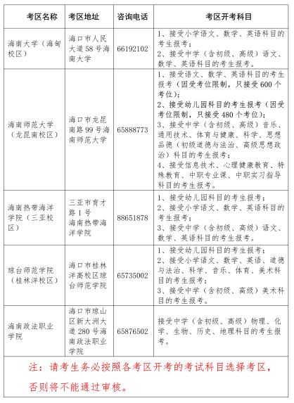 我省2023年上半年中小學(xué)教師資格考試(面試)共設(shè)海南大學(xué)(海甸校區(qū))、海南師范大學(xué)(龍昆南校區(qū))、海南熱帶海洋學(xué)院(三亞校區(qū))、瓊臺(tái)師范學(xué)院(桂林洋校區(qū))和海南政法職業(yè)學(xué)院五個(gè)考區(qū),報(bào)名結(jié)束后各考區(qū)根據(jù)實(shí)際報(bào)名情況設(shè)置考點(diǎn),考生參加考試的考點(diǎn)名稱與地址以準(zhǔn)考證上的為準(zhǔn)。現(xiàn)將考區(qū)信息公布如下: