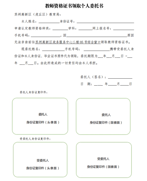 3.若委托他人代領證書,請參照附件2格式提交《教師資格證書領取個人委托書》(A4紙打。毺顚懴嚓P信息和粘貼委托人及受委托人的身份證復印件。辦理時,請受委托人現(xiàn)場出示個人身份證和委托人的委托書、相應畢業(yè)證書原件。