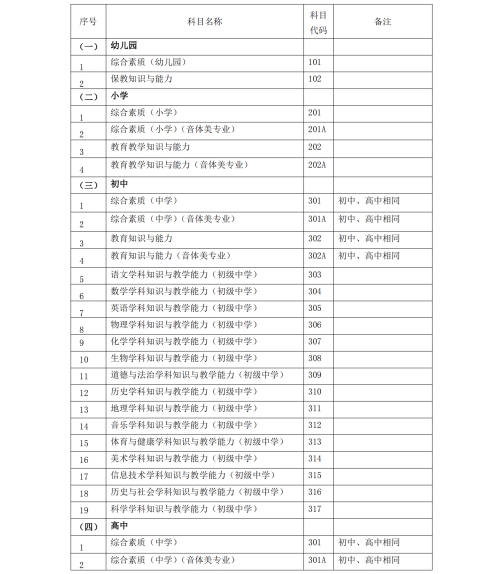 (一)根據(jù)教育部教師工作司印發(fā)的《關于中小學教師資格考試增加“心理健康教育”等學科的通知》(教師司函〔2017〕41號)和《關于中小學教師資格考試增加“特殊教育”等學科的通知》(教師司函〔2019〕51號)精神,我省中小學教師資格考試初中、高中、中職文化課類別繼續(xù)開設“ 心理健康教育”學科以及小學類別“心理健康教育”、“信息技術”學科和初中、高中類別“特殊教育”學科,繼續(xù)開設的筆試科目為兩科,分別與同類別的“科目一”和 “科目二”一致。
