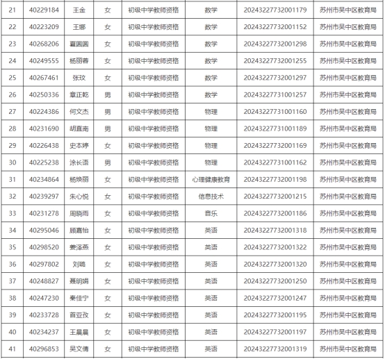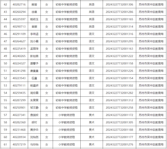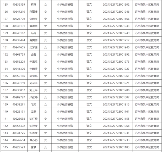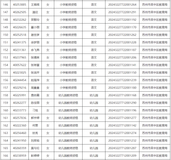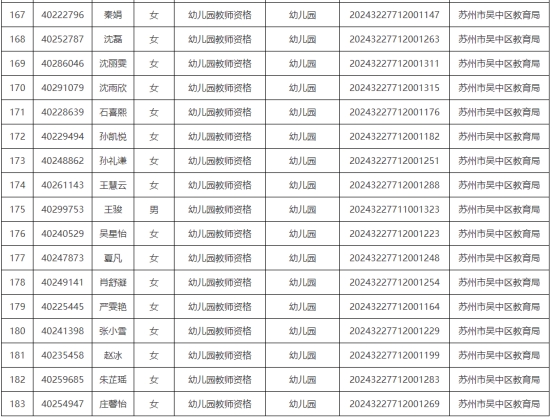 根據(jù)省、市教師資格認(rèn)定工作的要求,按照網(wǎng)上申請(qǐng)、體格檢查、現(xiàn)場(chǎng)確認(rèn)、違法犯罪記錄核查等程序,經(jīng)審定,2024年第三次共183人通過(guò)資格認(rèn)定,F(xiàn)將認(rèn)定結(jié)果予以公示(見(jiàn)附件1),公示時(shí)間為2024年11月27日至2024年12月2日。如有異議,可在公示期內(nèi)向蘇州市吳中區(qū)教育局人事與教師工作科反映,聯(lián)系電話:0512-67081181。