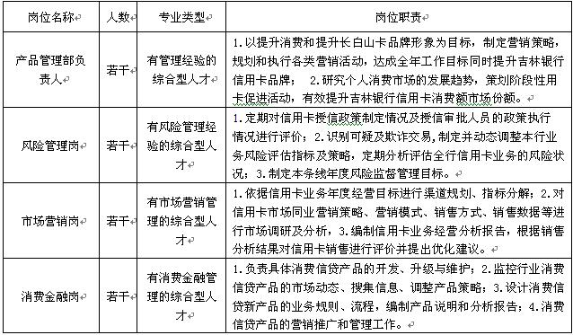 吉林銀行信用卡中心是個人金融總部下設(shè)的一級部門,主要承擔(dān)著整個吉林銀行信用卡產(chǎn)品開發(fā)、市場推廣、進(jìn)件審批、高風(fēng)險客戶管理、24小時客戶服務(wù)等職責(zé),F(xiàn)因吉林銀行總行信用卡中心業(yè)務(wù)發(fā)展需要,誠邀有識之士加盟。