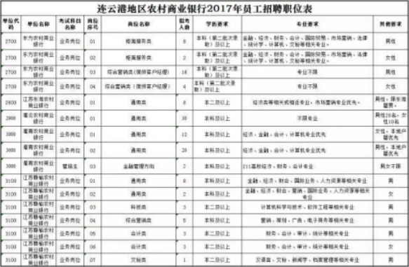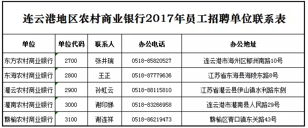 招聘職數(shù)及要求見《連云港地區(qū)農(nóng)村商業(yè)銀行2017年大學(xué)生員工招聘職位表》。