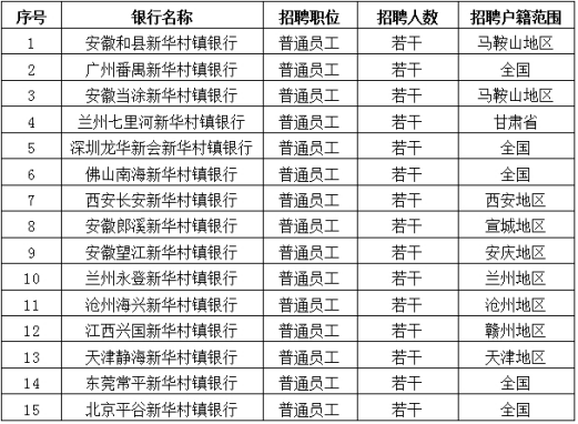 更好地服務“三農(nóng)”,支持中小企業(yè)發(fā)展,馬鞍山農(nóng)商銀行作為主發(fā)起行,分別成立了安徽當涂、廣州番禺、安徽郎溪、安徽和縣、江西興國、安徽望江、天津靜海、山東博興、蘭州七里河、蘭州永登、蘭州皋蘭、滄州鹽山、滄州海興、江門新會、佛山南海、東莞常平、大廠回族自治縣、北京平谷、西安長安、銅川耀州、深圳龍華等多家新華村鎮(zhèn)銀行,為滿足業(yè)務發(fā)展需要,部分新華村鎮(zhèn)銀行面向社會公開招聘英才,熱忱歡迎您的加盟,展示才智,共創(chuàng)未來。