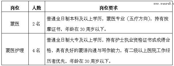 根據(jù)工作需要,烏海市蒙中醫(yī)院面向社會公開招聘蒙醫(yī)2名、蒙醫(yī)護(hù)理4名,現(xiàn)將有關(guān)事宜公告如下: