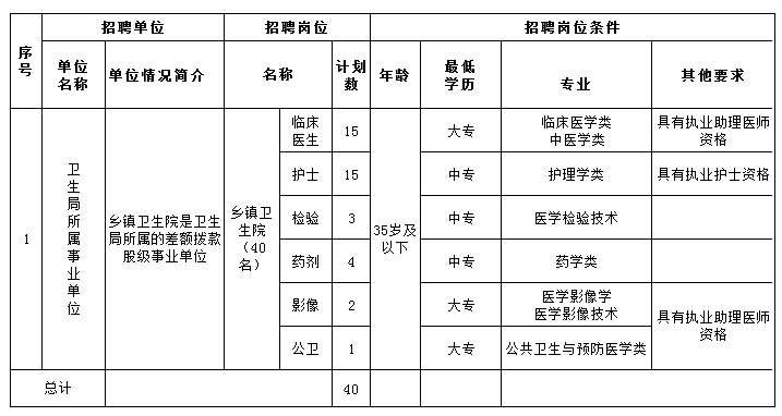 共招聘工作人員40名。具體崗位及數(shù)量見附表。