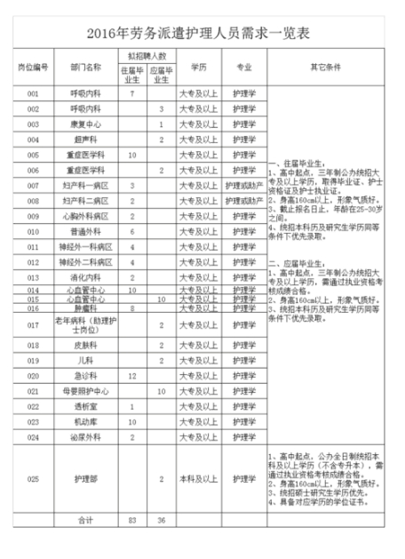 具體崗位及人數(shù),請查看附件《2016年咸陽市第一人民醫(yī)院勞務(wù)派遣護理人員需求一覽表》(以下簡稱《招聘需求一覽表》)進行查詢。