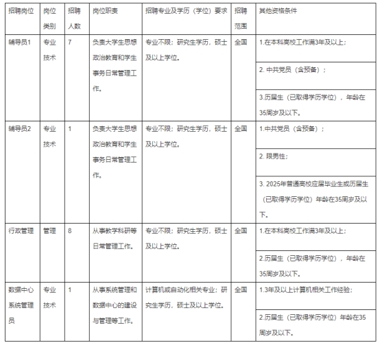輔導(dǎo)員崗的筆試內(nèi)容為高等教育學、教師倫理學、大學心理學、高等教育法規(guī)基礎(chǔ)等專業(yè)知識;行政管理崗位的筆試內(nèi)容為綜合基礎(chǔ)知識;數(shù)據(jù)中心系統(tǒng)管理員的筆試內(nèi)容為綜合基礎(chǔ)知識和崗位所必須具備的專業(yè)知識。