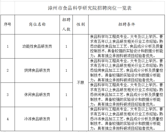 招聘人數(shù):4人。招聘崗位及具體條件詳見附表《漳州市食品科學研究院招聘崗位一覽表》。
