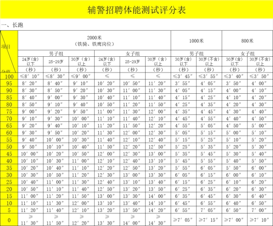 應(yīng)聘人員通過資格初審后需參加體能測試,項(xiàng)目包括:縱跳摸高和長跑(男1000米、女800米),標(biāo)準(zhǔn)參照《公安機(jī)關(guān)錄用人民警察體能測試項(xiàng)目和標(biāo)準(zhǔn)(試行)》。體能測試任何一項(xiàng)不合格不得進(jìn)入下一環(huán)節(jié),體能測試總分=縱跳摸高成績50%+長跑成績50%。測試時(shí)間和地點(diǎn)另行通知。