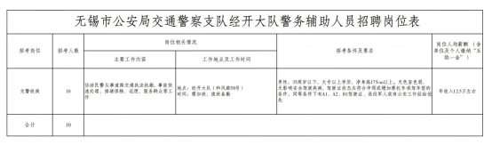 因公安工作需要,無錫市公安局經(jīng)開分局會同經(jīng)開交警大隊決定面向社會公開招聘警務(wù)輔助人員(非人民警察身份且非事業(yè)編制人員身份)80名,現(xiàn)將有關(guān)事項公告如下: