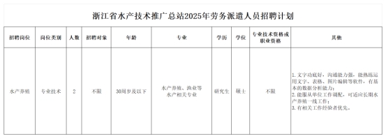 浙江省水產(chǎn)技術(shù)推廣總站(浙江省漁業(yè)檢驗(yàn)檢測與疫病防控中心)為浙江省農(nóng)業(yè)農(nóng)村廳直屬公益一類事業(yè)單位,機(jī)構(gòu)規(guī)格相當(dāng)于正處級。因工作需要,經(jīng)研究決定,向社會公開招聘勞務(wù)派遣工作人員2名,辦公地點(diǎn)位于杭州市余杭區(qū)現(xiàn)將有關(guān)事項(xiàng)公告如下: