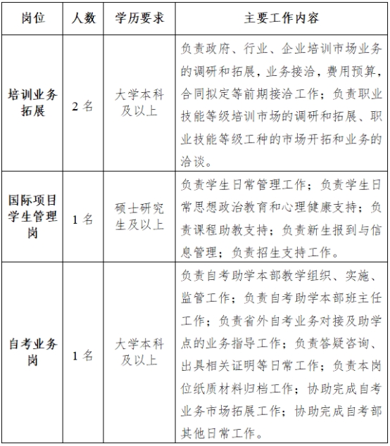 江南大學(xué)是教育部直屬、國(guó)家“211工程”重點(diǎn)建設(shè)高校和雙一流建設(shè)高校。學(xué)校以“篤學(xué)尚行,止于至善”為校訓(xùn),以“彰顯輕工特色,服務(wù)國(guó)計(jì)民生;創(chuàng)新培養(yǎng)模式,造就行業(yè)中堅(jiān)”為辦學(xué)理念,以建設(shè)“中國(guó)特色、世界一流、江南風(fēng)格的研究型大學(xué)”為戰(zhàn)略目標(biāo),深入推進(jìn)教育教學(xué)改革,持續(xù)提升辦學(xué)水平,已逐步建成一所規(guī)模結(jié)構(gòu)合理、學(xué)科協(xié)調(diào)發(fā)展、教學(xué)質(zhì)量?jī)?yōu)秀、辦學(xué)效益顯著、社會(huì)美譽(yù)度高,國(guó)內(nèi)有影響力、國(guó)際有知名度的特色鮮明的高水平大學(xué)。江南大學(xué)繼續(xù)教育學(xué)院,始于二十世紀(jì)八十年代,主要負(fù)責(zé)繼續(xù)教育的教育教學(xué)、學(xué)生管理以及非學(xué)歷教育的實(shí)施工作。學(xué)院秉承“強(qiáng)監(jiān)管、提質(zhì)量、謀轉(zhuǎn)型、創(chuàng)特色”的辦學(xué)理念,依托學(xué)校輕工特色辦學(xué)資源和地處長(zhǎng)三角經(jīng)濟(jì)發(fā)達(dá)地區(qū)的優(yōu)勢(shì),加強(qiáng)與企業(yè)、行業(yè)之間的合作,經(jīng)過(guò)30多年不懈的努力,形成了各類(lèi)型學(xué)歷繼續(xù)教育與非學(xué)歷教育有效融合、共同發(fā)展的新格局。根據(jù)學(xué)院改革發(fā)展需要,本著“公開(kāi)公平、擇優(yōu)錄用”的原則,現(xiàn)面向校內(nèi)外公開(kāi)招聘工作人員,有關(guān)事宜公告如下: