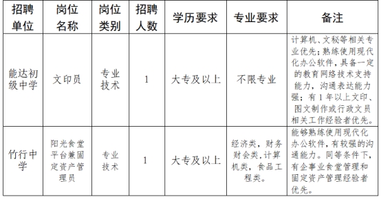 因工作需要,南通市能達(dá)初級(jí)中學(xué)和南通市竹行中學(xué)面向社會(huì)公開招聘政府購(gòu)買服務(wù)崗位工作人員,現(xiàn)將有關(guān)事項(xiàng)公告如下:
