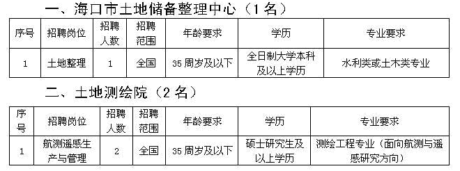 因工作需要,經(jīng)?谑腥肆Y源和社會保障局和?谑芯幬k核準同意,我局下屬事業(yè)單位面向社會招聘以下工作人員,招聘人員納入事業(yè)編制管理。因?谑型恋貎湔碇行耐恋毓芾韻徫辉趫竺刂谷掌谏袩o人報名,航測遙感生產(chǎn)與管理崗位報名達不到比例,經(jīng)?谑腥肆Y源和社會保障局批準,海口市土地儲備整理中心土地整理崗位學歷調(diào)整為全日制大學本科及以上學歷,專業(yè)調(diào)整為水利類或土木類專業(yè);航測遙感生產(chǎn)與管理崗位延長報名時間。以上崗位報名時間為5月26日至6月7日,共10個工作日。