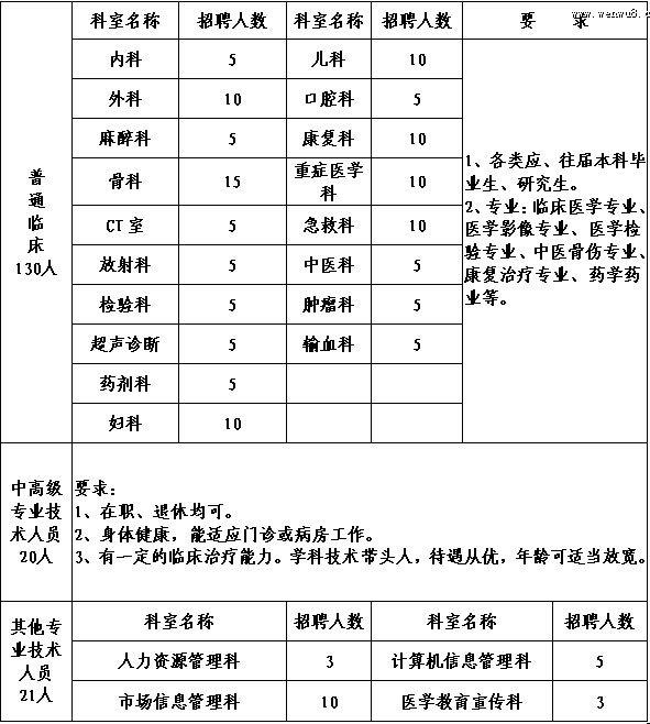 根據(jù)臨床各科人才需求,現(xiàn)擬定并公開招聘應(yīng)、往屆大學(xué)畢業(yè)生,研究生及中、高級專業(yè)技術(shù)人員171人,具體職位見附件。